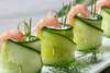 À l’aide d’un économe ou d’une mandoline, tailler 12 longs rubans dans le concombre.